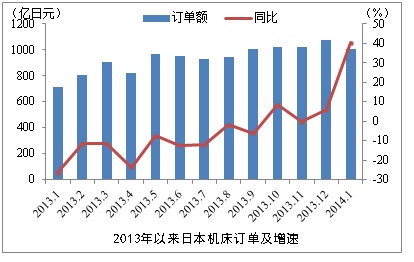 据日本机床工业协会统计,2014年1月,日本机床订单总额为1005.5亿日元,环比下降,同比增长40.3%,数控机床同比增长40.6%。其中,国内机床订单环比下降、同比增长39.1%;国外订单环比下降、同比增长40.3%。